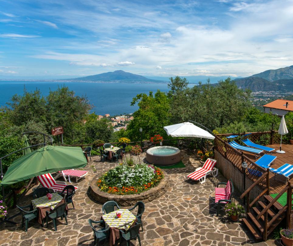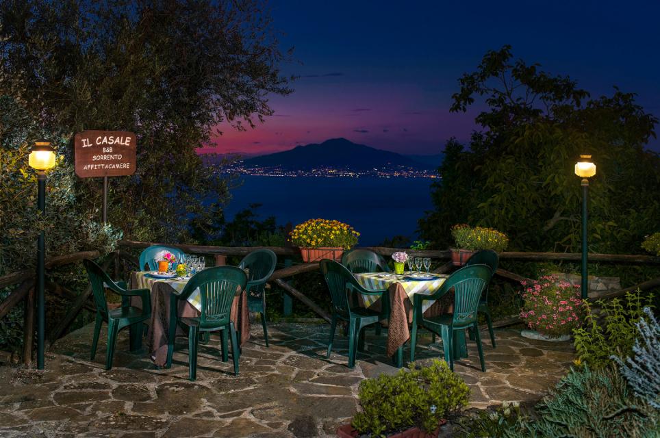 Casale Sorrento is located in a quiet position on the hills of Sorrento, immersed in a typical Sorrento citrus grove and surrounded by flowers and fruit trees. Thanks to its position it dominates the Gulf of Naples, offering a breathtaking view that embraces Vesuvius and the Sorrento Peninsula.